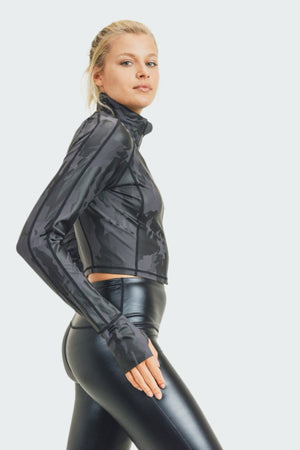 This cropped raglan jacket is composed of a polyester and spandex blend for maximum comfort, and is adorned with a stylish camo foil print. It showcases a high neckline, raglan long sleeves with thumbholes, side panel detailing for a slim appearance, and a zippered closure. A go-to piece to elevate your wardrobe. This cropped raglan jacket offers effortless style and long-lasting comfort for any occasion.